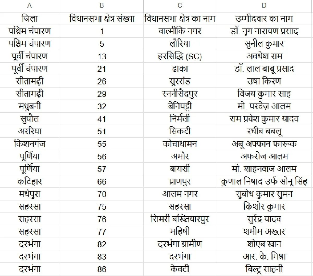ଜନ ସୂରଜ ରାଷ୍ଟ୍ରୀୟ ସଭାପତି ଉଦୟ ସିଂହ କହିଛନ୍ତି ଯେ, "ଆଜି ଆମେ ‘ଜନ ସୁରାଜ’ର ପ୍ରଥମ ତାଲିକା ପ୍ରକାଶ କରୁଛୁ। ଏହି ତାଲିକାରେ ୫୧ ଜଣ ପ୍ରାର୍ଥୀଙ୍କ ନାମ ଅନ୍ତର୍ଭୁକ୍ତ।