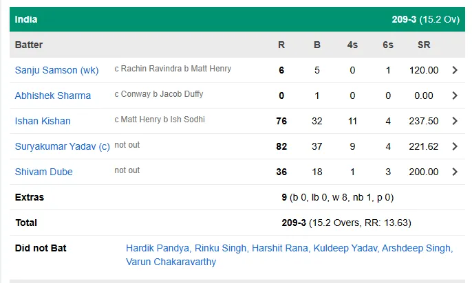ସଂକ୍ଷିପ୍ତ ସ୍କୋର: ନ୍ୟୁଜିଲାଣ୍ଡ୍ ୨୦ ଓଭରରେ ୨୦୮/୬ (ମିଚେଲ୍ ସାଣ୍ଟନର୍-୪୭*, ରାଚିନ ରବୀନ୍ଦ୍ର-୪୪, କୁଲଦୀପ ଯାଦବ-୨/୩୫, ଶିବମ ଦୁବେ-୧/୭, ହାର୍ଦିକ ପାଣ୍ଡ୍ୟା-୧/୨୫, ବରୁଣ ଚକ୍ରବର୍ତ୍ତୀ-୧/୩୫, ହର୍ଷିତ ରାଣା-୧/୩୫)। ଭାରତ ୧୫.୨ ଓଭରରେ ୨୦୯/୩ (ସୂର୍ଯ୍ୟକୁମାର ଯାଦବ-୮୨*, ଈଶାନ କିଶନ-୭୬, ଶିବମ ଦୁବେ-୩୬*, ଈଶ ସୋଢ଼ୀ-୧/୩୪, ଜାକବ ଡଫି-୧/୩୮, ମ୍ୟାଟ୍ ହେନରି-୧/୪୧)